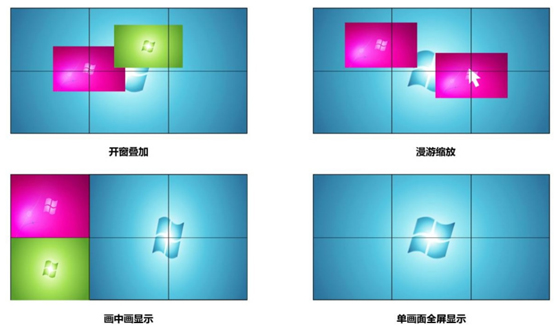 云媒体交互拼接系统采用业界领先的图像处理引擎技术,确保所有音视频信号实时处理显示,实现所有网络摄像机、电脑、DVD等输入信号源在不同地点的任意显示屏终端上(包括dlp拼接墙、lcd 拼接墙、led屏、投影机、液晶电视等)无缝切换、信号预监回显、任意窗口、任意缩放、任意跨屏、漫游、叠加显示并且可自定义拼接模式。