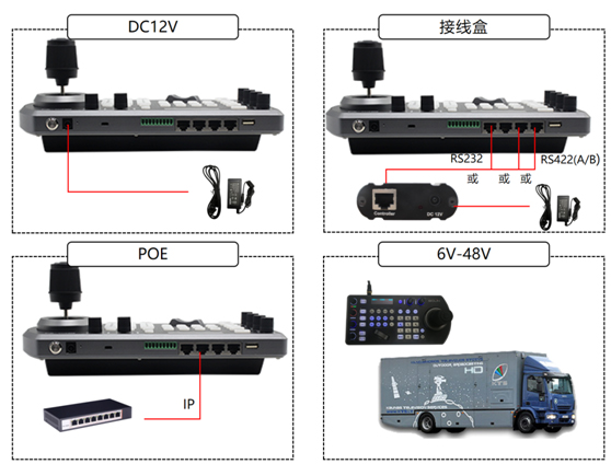 支持DC 12V、PoE(IEEE802.3at)供电,还可以通过接线盒的串口控制线供电,让布线变简单,部署变灵活。宽电压范围6V – 48V,可被广播车、移动设备车供电,并适用更长距离的电源传输。