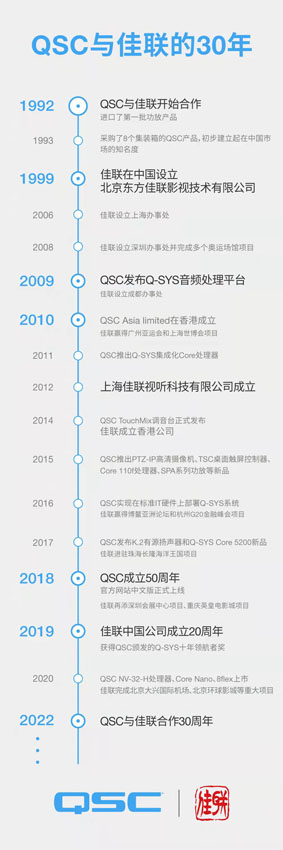 过去的30年,佳联公司与QSC公司相互扶持、共同成就、共历风雨;未来的30年,双方还将携手并进、发展共赢、再创辉煌!
