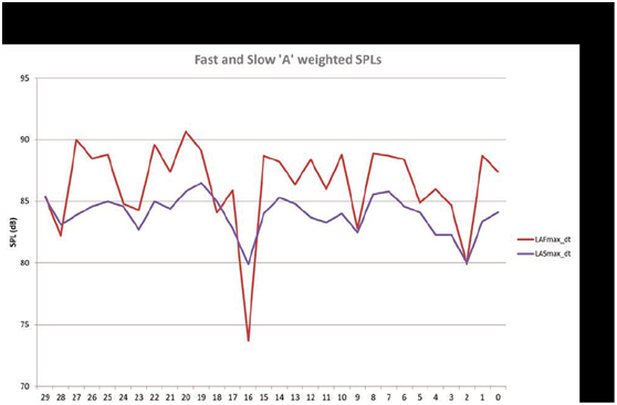最模糊的红色曲线显示最大均方根(RMS)每1秒样本时期获取一次声压级值。(正在整合的样本在125毫秒的时间内,等于声级计上的“快速”读𬮿。)在这种情况下,平均最大值为86dBA,而记录的最大值是91dBA。换句话说,300个样本中的一个达到91dBA。