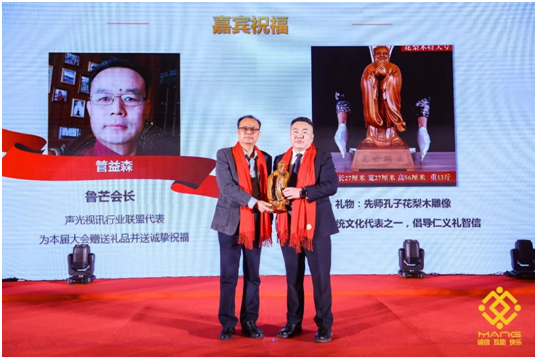 声光视讯行业联盟代表鲁芒会长管益森先生,现场为本届大会赠送孔子花梨木雕像礼物并送上祝福。