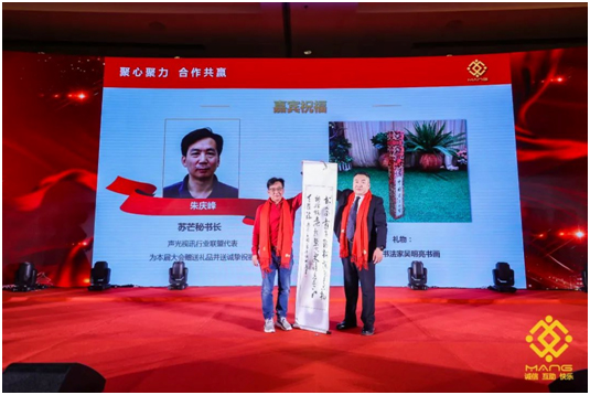 声光视讯行业联盟代表苏芒秘书长朱庆峰先生,现场为本届大会赠送南京书法家吴明亮书画并送上祝福。