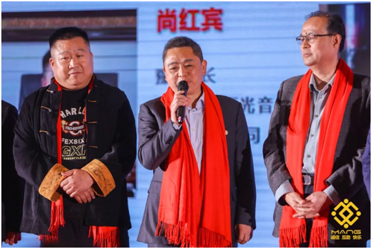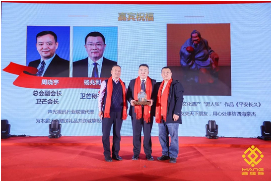 声光视讯行业联盟代表总会副会长、卫芒会长周晓宇先生,卫芒秘书长杨兆利先生,现场为本届大会赠送中华非物质文化遗产“泥人张”作品《平安长久》礼物,寓意以酒会友交天下朋友,用心处事结四海豪杰。