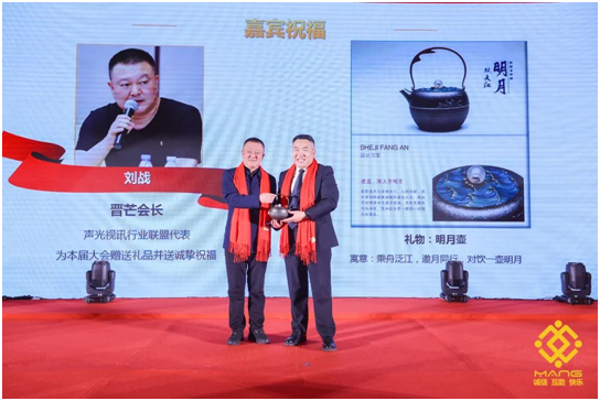 声光视讯行业联盟代表晋芒会长刘战先生,现场为本届大会赠送明月壶礼物,寓意着协会会员乘舟泛江,邀月同行,对饮一壶明月。