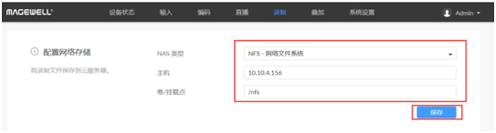 2、在弹出的页面中,配置录制参数:“NAS类型” 支持CIFS-通用互联网文件系统(默认)和NFS-网络文件系统,本文以NFS为例。“主机” 输入NAS的主机IP地址,如下图的“10.10.4.156”。“卷/挂载点” 即mount-point,指定目的存储盘名称,如下图的“/nfs”,设置后点击“保存”。
