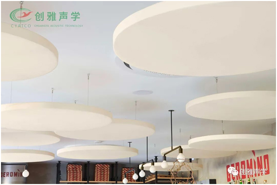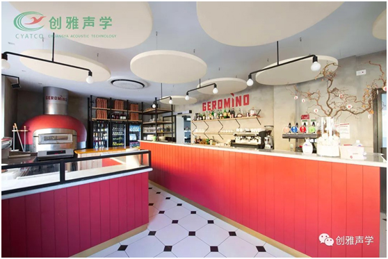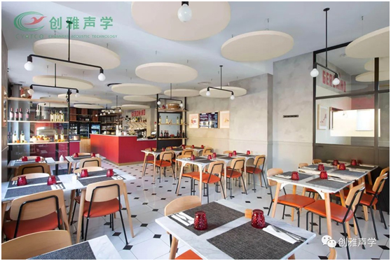 该项目的目的是将吸音材料均匀地分布在空间的整个表面上。设计师选择可悬挂式玻纤吸声体。特殊的固定系统可以将玻纤吸音面板放置在距天花板的最佳距离处,以便在桌子和吧台的水平上有效地拦截声波。