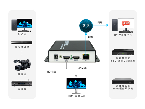 4K HDMI超高清编码器(采集盒)是专业的高清音视频编码产品,只需要占用较小的带宽,即可获得高清晰度的视频信号。该产品采用H.265/H.264/MJPEG编码格式,可同时对视频音频进行编码。输出TS双码流设计,可根据不同需要设置每一路的输出码流分辨率。该设备具有高集成,低成本的优势,可广泛应用于各种数字电视播出系统中。支持3U结构,一台机箱可插入16张采集卡,双电源冗余结构,系统更稳定。完美支持VLC解码。