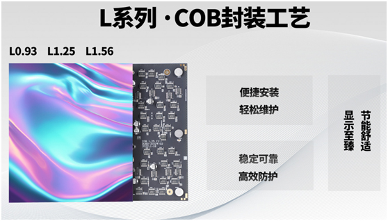 L系列采用全倒装COB封装工艺,发光芯片直接与PCB板的焊盘键合,焊接面积由点到面,焊接面积增大,焊点减少,产品性能更稳定。封装层无焊线空间,封装层更轻薄,降低热阻,提高显示屏寿命。