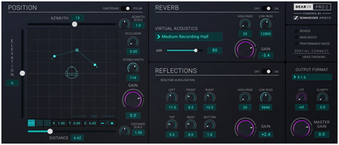 dearVR PRO 2 图形界面,包含 XYZ 位置、早期反射、后期混响和输出部分