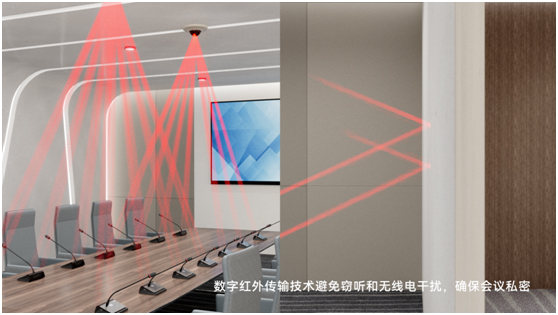 在没有预留设备安装孔位的礼堂会议室,TAIDEN数字红外无线会议系统是首选方案。该系统融合了数字化、无线化和红外传输技术,采用dirATC—数字红外音频传输及控制技术,具有防窃听抗干扰特性,无电磁辐射,不会与相邻会议室发生干扰,确保会议内容的安全和私密性。