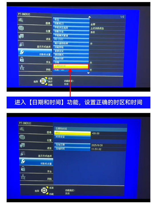 操作步骤:按【菜单】键进入菜单,选择【投影机设置】进入投影机设置的选项。进入【日期和时间】功能进行设置。
