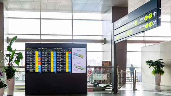 光线明亮的候机厅内,索尼商显提供清晰的航显信息显示