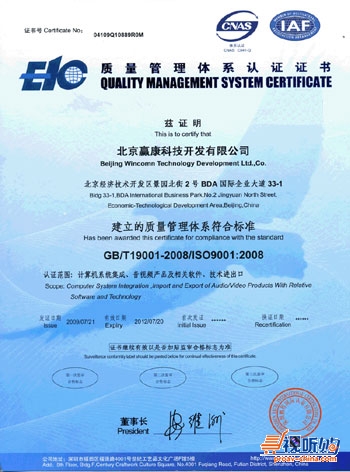 2009年7月31日,赢康科技通过了GB/T 19001-2008/ISO 9001:2008质量管理体系认证,并获得了为期三年的相关认证证书。认证范围为:计算机系统集成、音视频产品及相关软件、技术进出口。